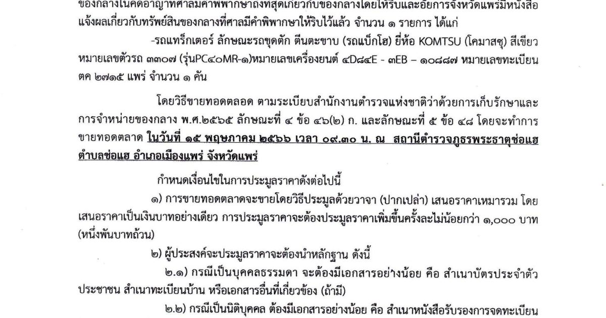 ประกาศ สถานีตำรวจภูธรพระธาตุช่อแฮ จังหวัดแพร่ เรื่อง ขายทอดตลาดของกลางในคดีอาญา รถแทร็กเตอร์ (รถแบ็กโฮ)ยี่ห้อ KOMTSU โคมาสซุ สีเขียว จำนวน 1 คัน